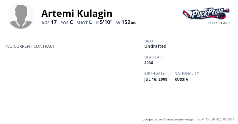 | 2023-24 | 15 | Russia U17 Finals | Traktor Chelyabinsk U17 | 5 | 0 | 1 | 1 | 0 | ||||||||||||||||||||||