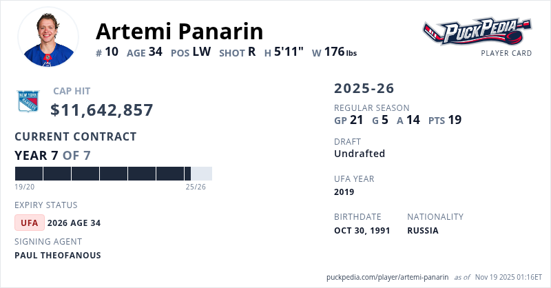 Artemi Panarin is signed to a 7 year, $81,499,999 contract with a cap hit of $11,642,857 per season, playing for the New York Rangers. His contract expires at the end of the 2025-26 season, making Panarin an Unrestricted Free Agent.
