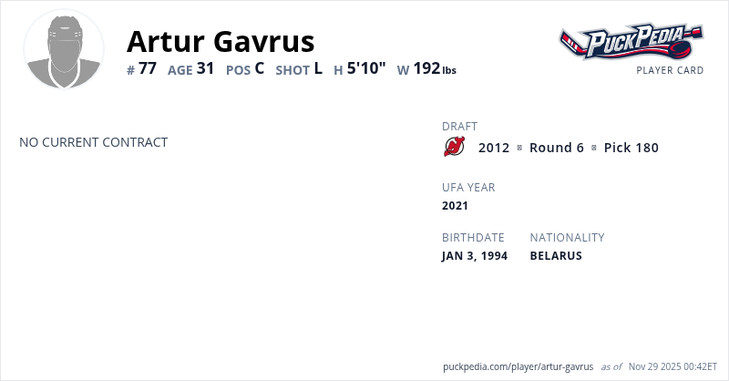 | 2021-22 | 27 | Belarus | Metallurg Zhlobin | 42 | 12 | 16 | 28 | 4 | Playoffs | 18 | 5 | 4 | 9 | 0 | ||||||||||||||||