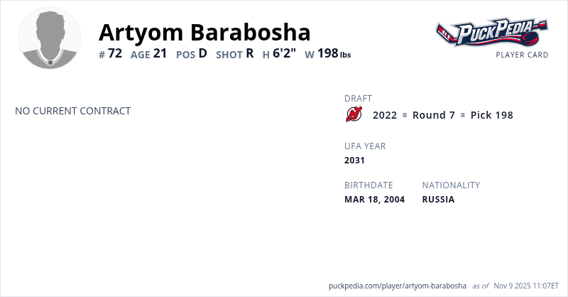 | 2022-23 | 18 | MHL | Krasnaya Armiya Moskva | 48 | 1 | 4 | 5 | 49 | Playoffs | 4 | 0 | 0 | 0 | 0 | ||||||||||||||||