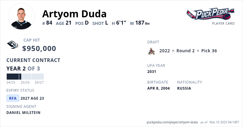 Artyom Duda is signed to a 3 year, $2,850,000 contract with a cap hit of $950,000 per season, playing for the Utah Mammoth. His contract expires at the end of the 2026-27 season, making Duda a Restricted Free Agent.