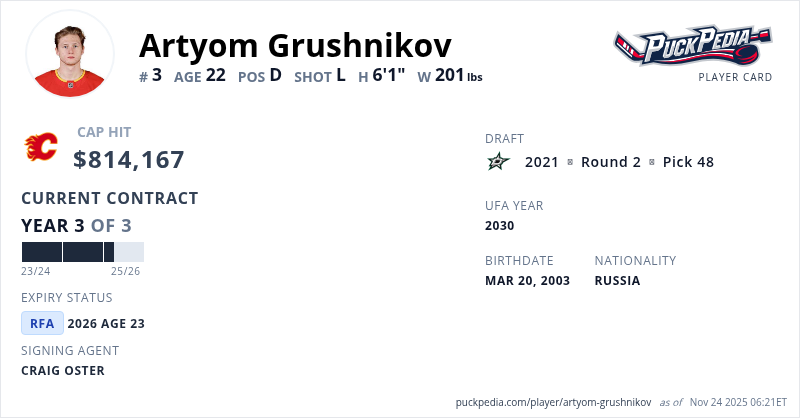 Artyom Grushnikov is signed to a 3 year, $2,442,501 contract with a cap hit of $814,167 per season, playing for the Calgary Flames. His contract expires at the end of the 2025-26 season, making Grushnikov a Restricted Free Agent.