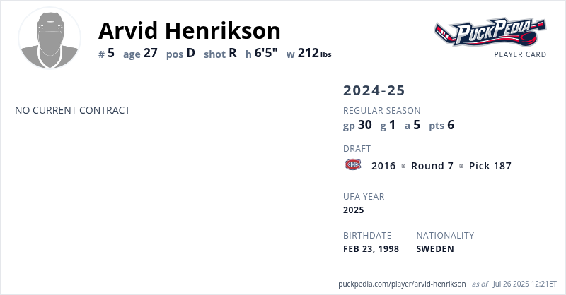 | 2023-24 | 25 | HockeyAllsvenskan | AIK | 32 | 0 | 0 | 0 | 14 | ||||||||||||||||||||||