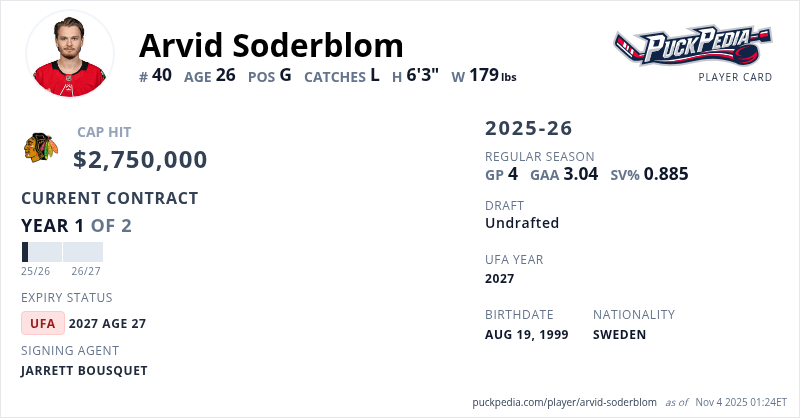Arvid Soderblom is signed to a 2 year, $5,500,000 contract with a cap hit of $2,750,000 per season, playing for the Chicago Blackhawks. His contract expires at the end of the 2026-27 season, making Soderblom an Unrestricted Free Agent.