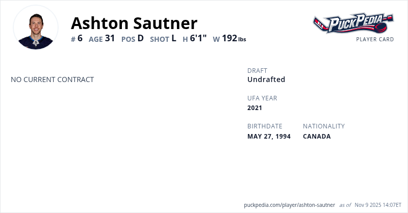 Ashton Sautner is an Unrestricted Free Agent. His last contract was 1 year, $775,000 with a cap hit of $775,000 per season. It expired at the end of the 2023-24 season.