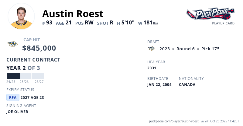 Austin Roest is signed to a 3 year, $2,535,000 contract with a cap hit of $845,000 per season, playing for the Nashville Predators. His contract expires at the end of the 2026-27 season, making Roest a Restricted Free Agent.