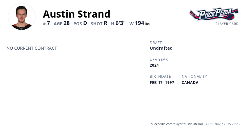 Austin Strand is an Unrestricted Free Agent (Group 6). His last contract was 1 year, $750,000 with a cap hit of $750,000 per season. It expired at the end of the 2022-23 season.