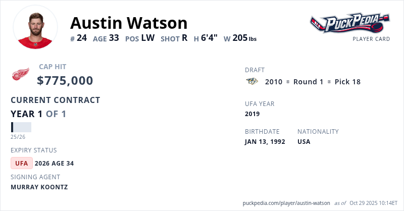 Austin Watson is signed to a 1 year, $775,000 contract with a cap hit of $775,000 per season, playing for the Detroit Red Wings. His contract expires at the end of the 2025-26 season, making Watson an Unrestricted Free Agent.