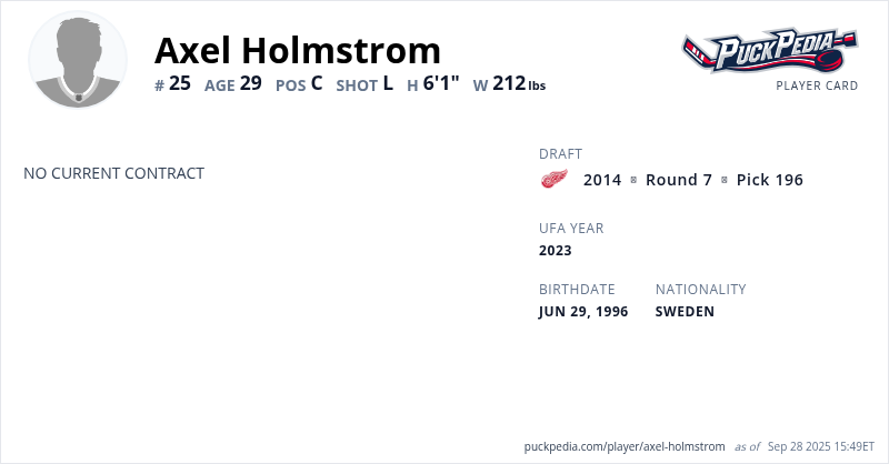 Axel Holmstrom is an Unrestricted Free Agent (No Qualifying Offer). His last contract was 4 years, $2,777,501 with a cap hit of $694,375 per season. It expired at the end of the 2018-19 season.