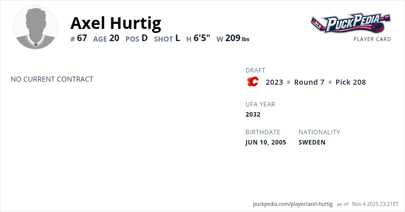 | 2024-25 | 19 | WHL | Calgary Hitmen | 55 | 5 | 11 | 16 | 29 | Playoffs | 11 | 1 | 2 | 3 | 0 | ||||||||||||||||