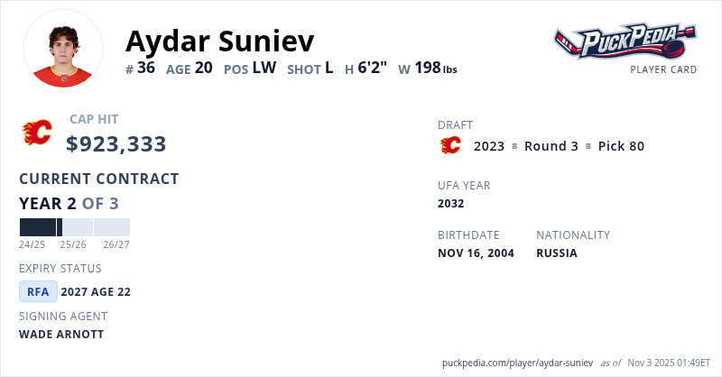 Aydar Suniev is signed to a 3 year, $2,769,999 contract with a cap hit of $923,333 per season, playing for the Calgary Flames. His contract expires at the end of the 2026-27 season, making Suniev a Restricted Free Agent.