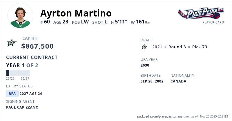 Ayrton Martino is signed to a 2 year, $1,735,000 contract with a cap hit of $867,500 per season, playing for the Dallas Stars. His contract expires at the end of the 2026-27 season, making Martino a Restricted Free Agent.