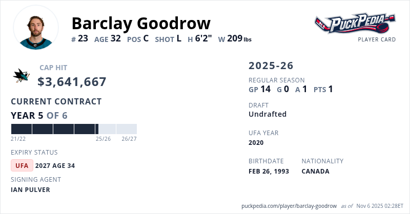 Barclay Goodrow is signed to a 6 year, $21,850,002 contract with a cap hit of $3,641,667 per season, playing for the San Jose Sharks. His contract expires at the end of the 2026-27 season, making Goodrow an Unrestricted Free Agent.