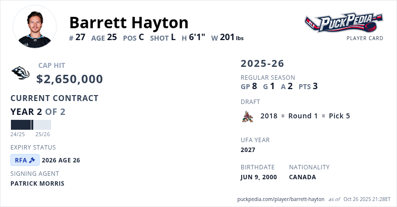 Barrett Hayton is signed to a 2 year, $5,300,000 contract with a cap hit of $2,650,000 per season, playing for the Utah Mammoth. His contract expires at the end of the 2025-26 season, making Hayton a Restricted Free Agent.