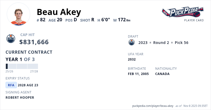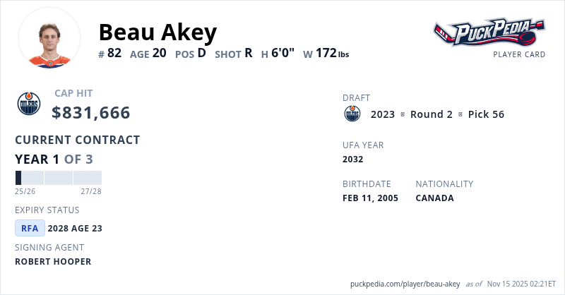 Beau Akey is signed to a 3 year, $2,494,998 contract with a cap hit of $831,666 per season, playing for the Edmonton Oilers. His contract expires at the end of the 2027-28 season, making Akey a Restricted Free Agent.
