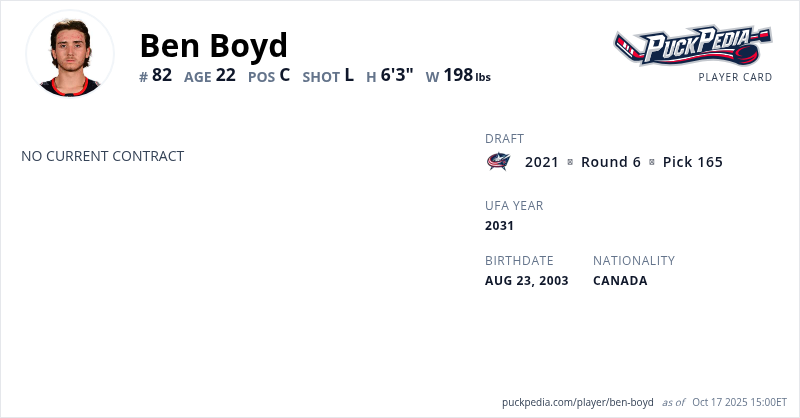| 2021-22 | 18 | QMJHL | Charlottetown Islanders | 38 | 7 | 9 | 16 | 47 | Playoffs | 10 | 1 | 0 | 1 | 0 | ||||||||||||||||