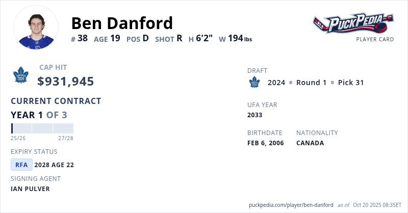 Ben Danford is signed to a 3 year, $2,795,835 contract with a cap hit of $931,945 per season, playing for the Toronto Maple Leafs. His contract expires at the end of the 2027-28 season, making Danford a Restricted Free Agent.