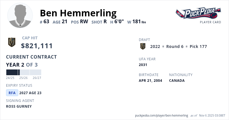 Ben Hemmerling is signed to a 3 year, $2,463,333 contract with a cap hit of $821,111 per season, playing for the Vegas Golden Knights. His contract expires at the end of the 2026-27 season, making Hemmerling a Restricted Free Agent.