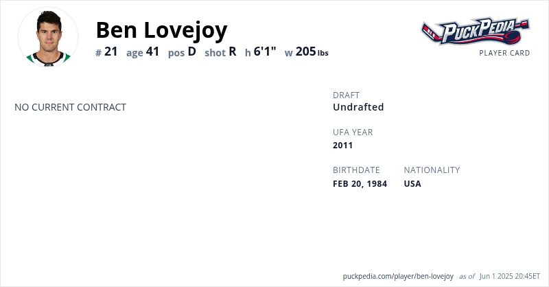 Ben Lovejoy is an Unrestricted Free Agent. His last contract was 3 years, $8,000,000 with a cap hit of $2,666,667 per season. It expired at the end of the 2018-19 season.