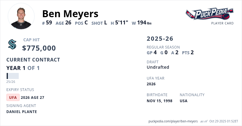 Ben Meyers is signed to a 1 year, $775,000 contract with a cap hit of $775,000 per season, playing for the Seattle Kraken. His contract expires at the end of the 2025-26 season, making Meyers an Unrestricted Free Agent.