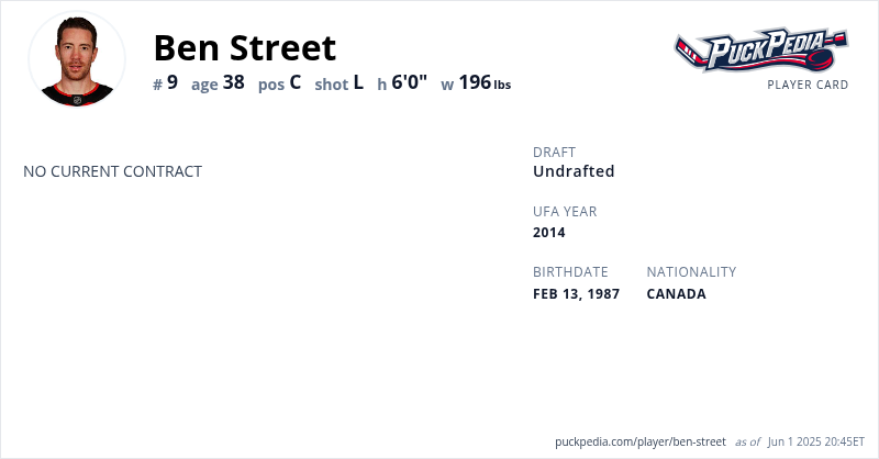 Ben Street is an Unrestricted Free Agent. His last contract was 1 year, $750,000 with a cap hit of $750,000 per season. It expired at the end of the 2020-21 season.