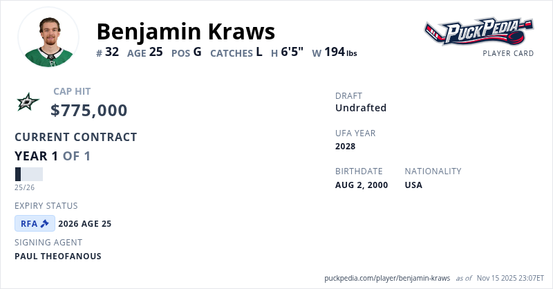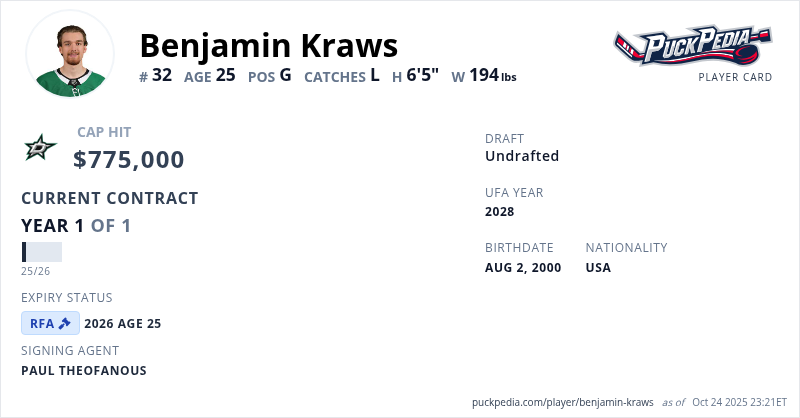 Benjamin Kraws is signed to a 1 year, $775,000 contract with a cap hit of $775,000 per season, playing for the Dallas Stars. His contract expires at the end of the 2025-26 season, making Kraws a Restricted Free Agent.
