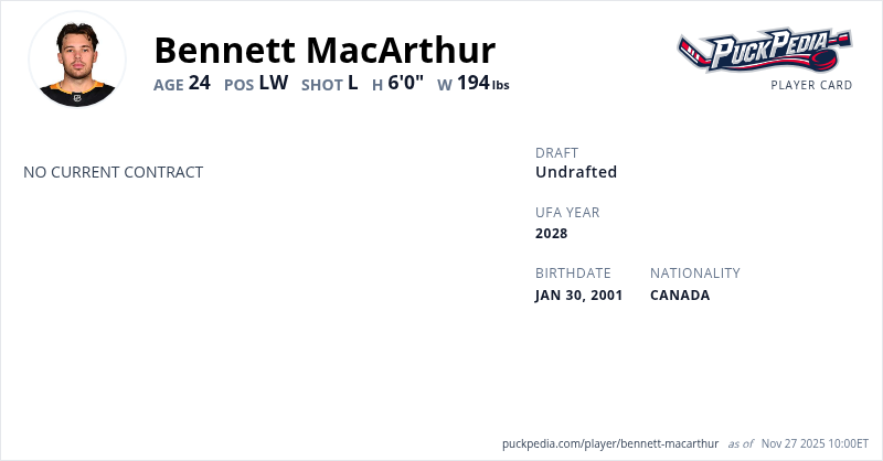 Bennett MacArthur is an Unrestricted Free Agent (No Qualifying Offer). His last contract was 3 years, $2,577,501 with a cap hit of $859,167 per season. It expired at the end of the 2024-25 season.