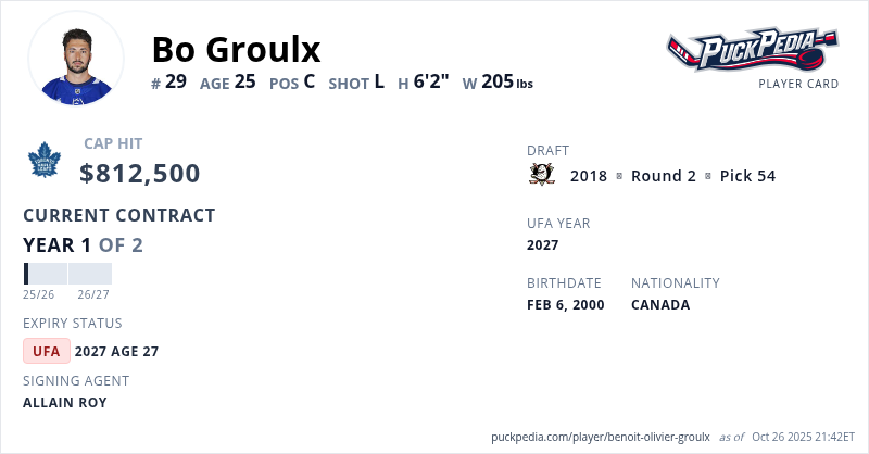 Bo Groulx is signed to a 2 year, $1,625,000 contract with a cap hit of $812,500 per season, playing for the Toronto Maple Leafs. His contract expires at the end of the 2026-27 season, making Groulx an Unrestricted Free Agent.