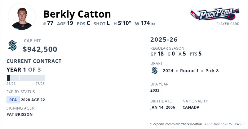 Berkly Catton is signed to a 3 year, $2,827,500 contract with a cap hit of $942,500 per season, playing for the Seattle Kraken. His contract expires at the end of the 2027-28 season, making Catton a Restricted Free Agent.