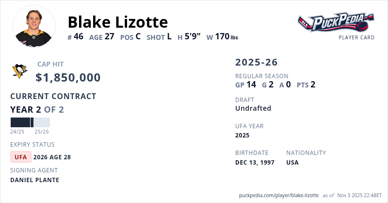 Blake Lizotte is signed to a 2 year, $3,700,000 contract with a cap hit of $1,850,000 per season, playing for the Pittsburgh Penguins. His contract expires at the end of the 2025-26 season, making Lizotte an Unrestricted Free Agent.