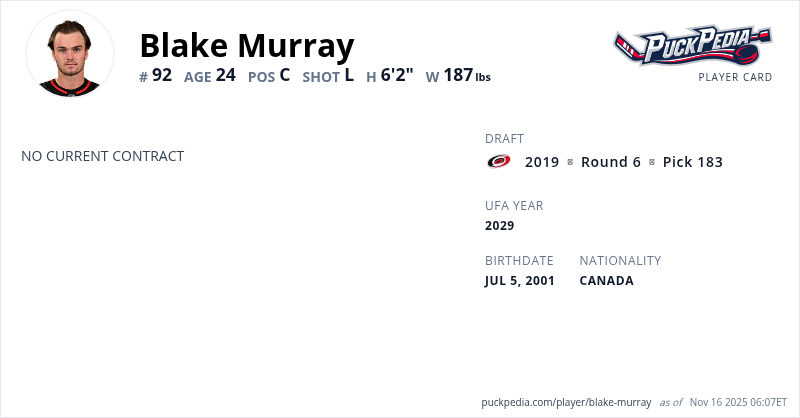 Blake Murray is an Unrestricted Free Agent (No Qualifying Offer). His last contract was 3 years, $2,375,001 with a cap hit of $791,667 per season. It expired at the end of the 2023-24 season.