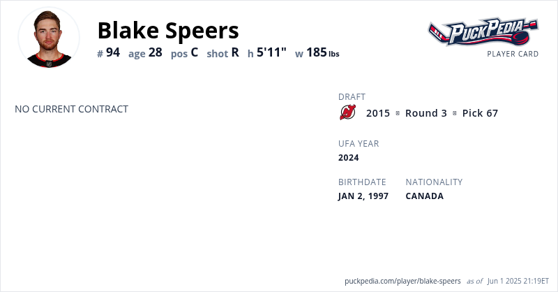 Blake Speers is an Unrestricted Free Agent. His last contract was 1 year, $750,000 with a cap hit of $750,000 per season. It expired at the end of the 2021-22 season.
