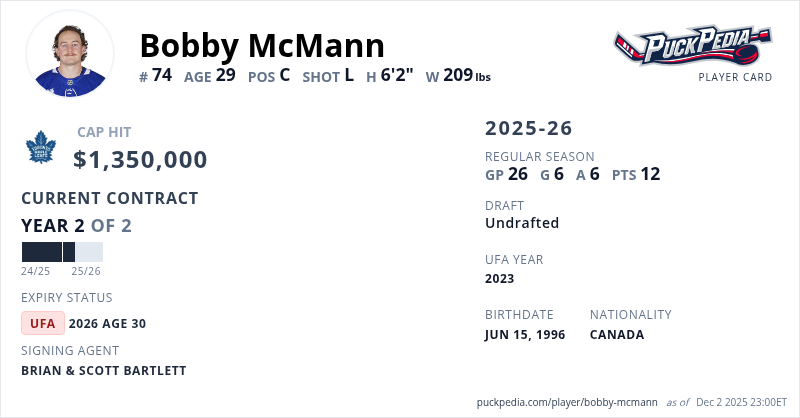 Bobby McMann is signed to a 2 year, $2,700,000 contract with a cap hit of $1,350,000 per season, playing for the Toronto Maple Leafs. His contract expires at the end of the 2025-26 season, making McMann an Unrestricted Free Agent.
