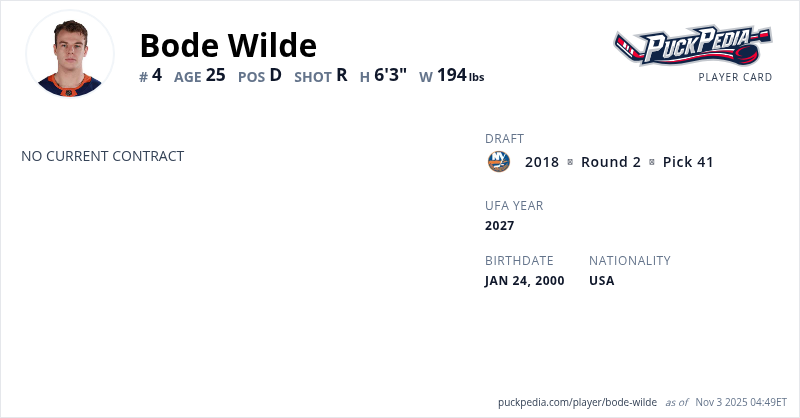 Bode Wilde is an Unrestricted Free Agent (No Qualifying Offer). His last contract was 3 years, $2,292,501 with a cap hit of $764,167 per season. It expired at the end of the 2022-23 season.