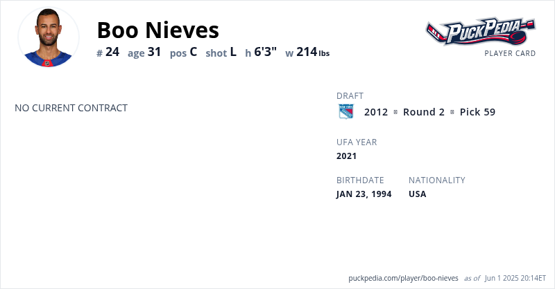 Boo Nieves is an Unrestricted Free Agent. His last contract was 1 year, $708,000 with a cap hit of $708,000 per season. It expired at the end of the 2020-21 season.