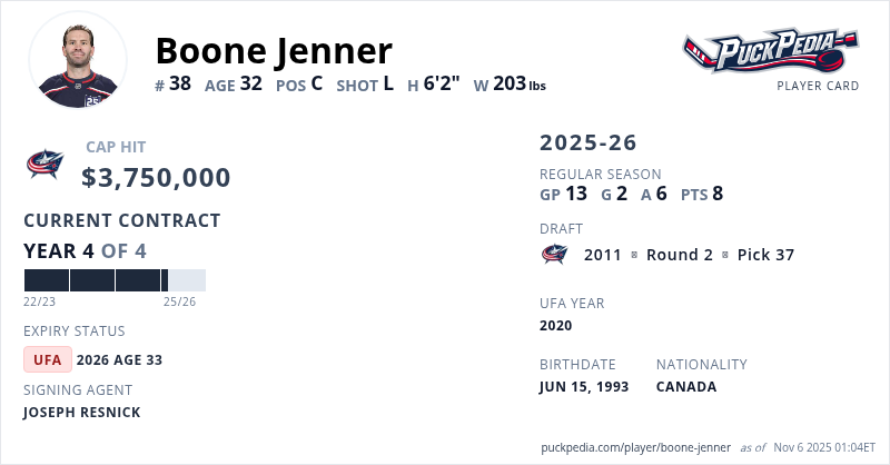 Boone Jenner is signed to a 4 year, $15,000,000 contract with a cap hit of $3,750,000 per season, playing for the Columbus Blue Jackets. His contract expires at the end of the 2025-26 season, making Jenner an Unrestricted Free Agent.