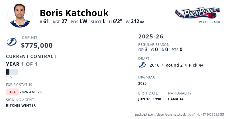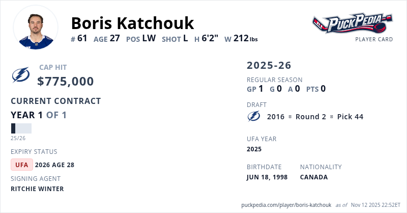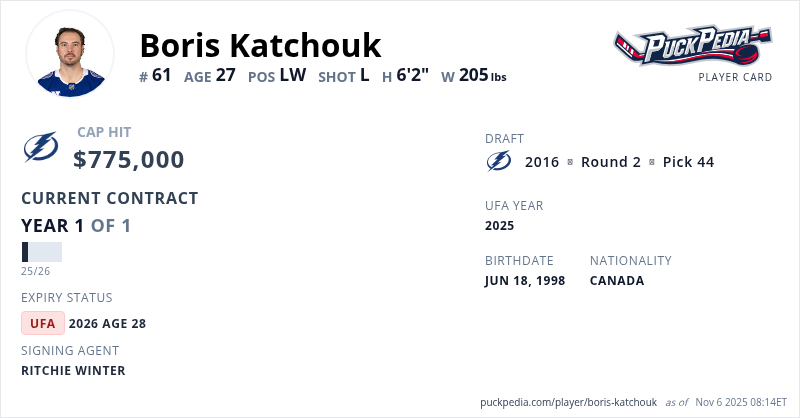 Boris Katchouk is signed to a 1 year, $775,000 contract with a cap hit of $775,000 per season, playing for the Tampa Bay Lightning. His contract expires at the end of the 2025-26 season, making Katchouk an Unrestricted Free Agent.