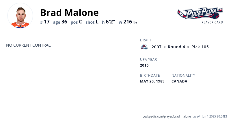 Brad Malone is an Unrestricted Free Agent. His last contract was 2 years, $1,525,000 with a cap hit of $762,500 per season. It expired at the end of the 2023-24 season.