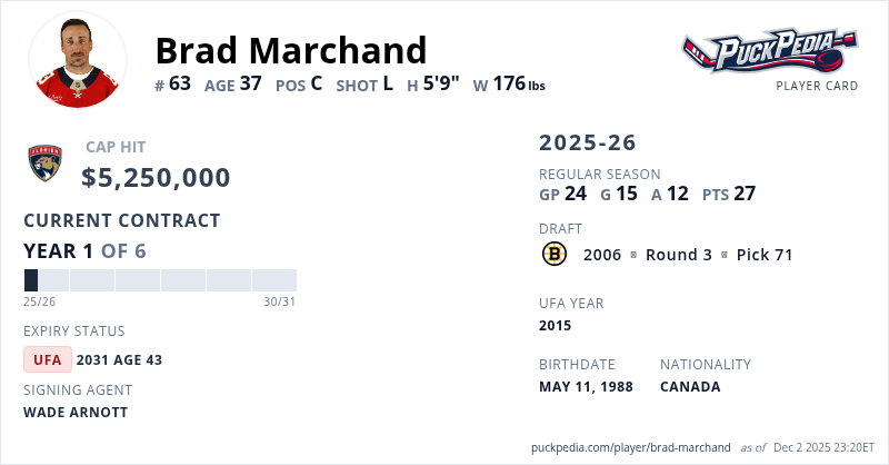 Brad Marchand is signed to a 6 year, $31,500,000 contract with a cap hit of $5,250,000 per season, playing for the Florida Panthers. His contract expires at the end of the 2030-31 season, making Marchand an Unrestricted Free Agent.