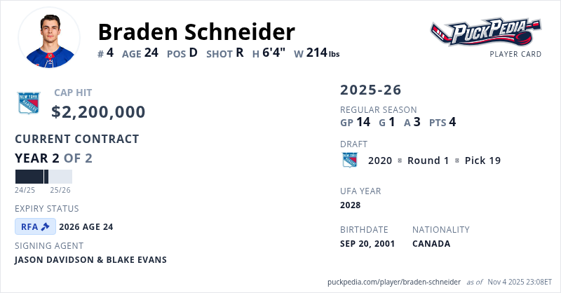 Braden Schneider is signed to a 2 year, $4,400,000 contract with a cap hit of $2,200,000 per season, playing for the New York Rangers. His contract expires at the end of the 2025-26 season, making Schneider a Restricted Free Agent.