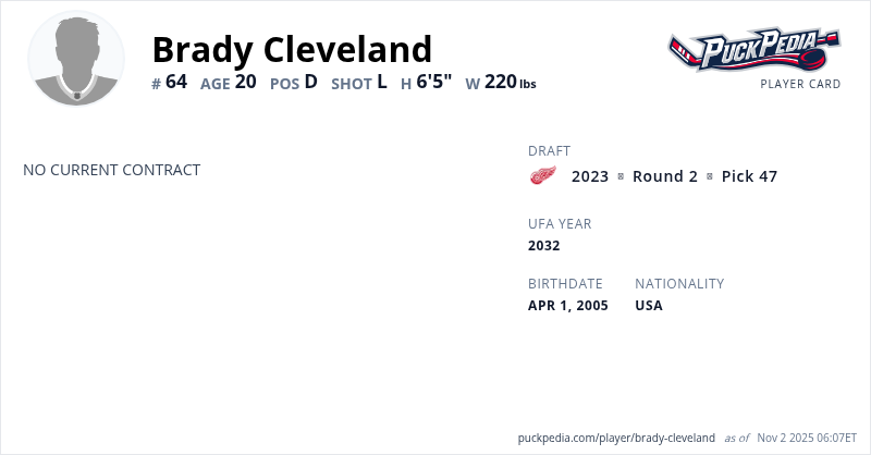 Cleveland was selected 47th overall by the Detroit Red Wings in the 2023 NHL Entry Draft on Thursday.
