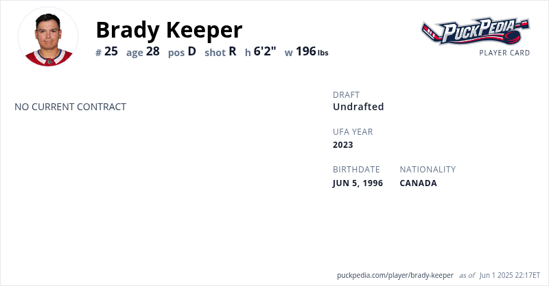 Brady Keeper is an Unrestricted Free Agent. His last contract was 1 year, $775,000 with a cap hit of $775,000 per season. It expired at the end of the 2023-24 season.