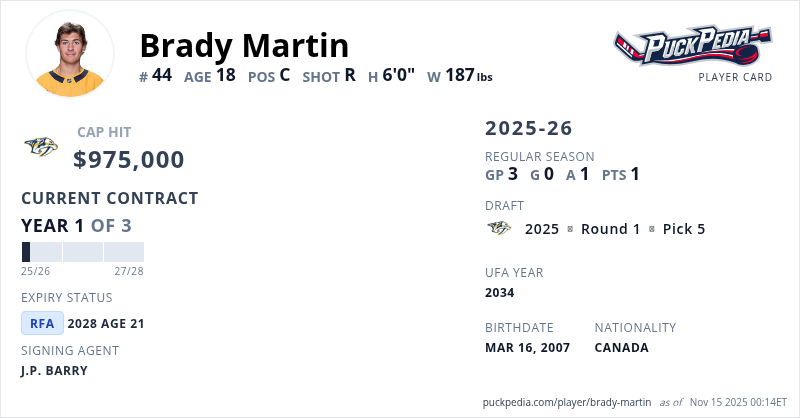 Brady Martin is signed to a 3 year, $2,925,000 contract with a cap hit of $975,000 per season, playing for the Nashville Predators. His contract expires at the end of the 2027-28 season, making Martin a Restricted Free Agent.