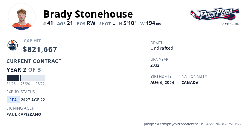 Brady Stonehouse is signed to a 3 year, $2,465,001 contract with a cap hit of $821,667 per season, playing for the Edmonton Oilers. His contract expires at the end of the 2026-27 season, making Stonehouse a Restricted Free Agent.