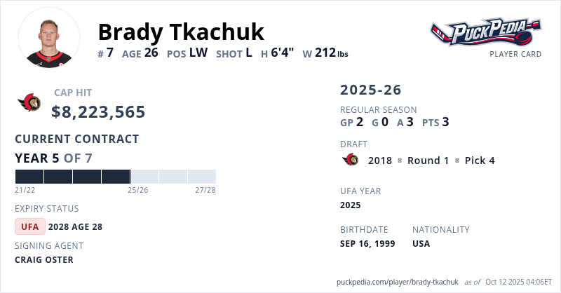 Brady Tkachuk is signed to a 7 year, $57,564,958 contract with a cap hit of $8,223,565 per season, playing for the Ottawa Senators. His contract expires at the end of the 2027-28 season, making Tkachuk an Unrestricted Free Agent.