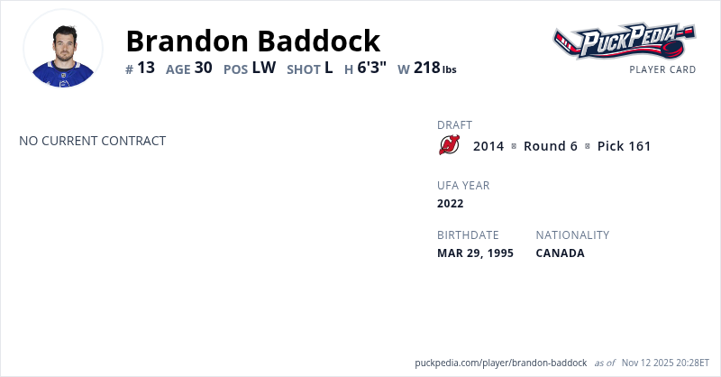 Brandon Baddock is an Unrestricted Free Agent. His last contract was 1 year, $750,000 with a cap hit of $750,000 per season. It expired at the end of the 2022-23 season.