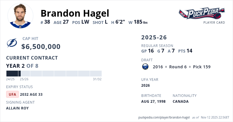 Brandon Hagel is signed to a 8 year, $52,000,000 contract with a cap hit of $6,500,000 per season, playing for the Tampa Bay Lightning. His contract expires at the end of the 2031-32 season, making Hagel an Unrestricted Free Agent.
