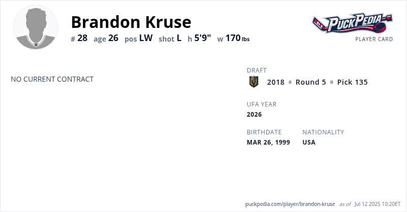 | 2024-25 | 25 | ECHL | Toledo Walleye | 72 | 9 | 32 | 41 | 48 | Playoffs | 20 | 0 | 12 | 12 | 0 | ||||||||||||||||