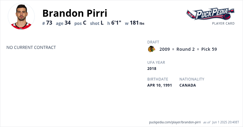 Brandon Pirri is an Unrestricted Free Agent. His last contract was 2 years, $1,550,000 with a cap hit of $775,000 per season. It expired at the end of the 2020-21 season.