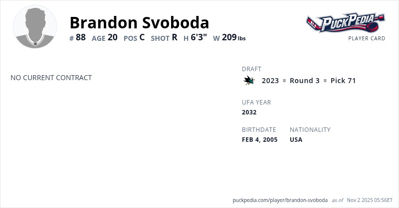 Svoboda was selected 71st overall by the San Jose Sharks in the 2023 NHL Entry Draft on Thursday.